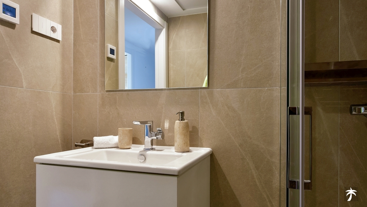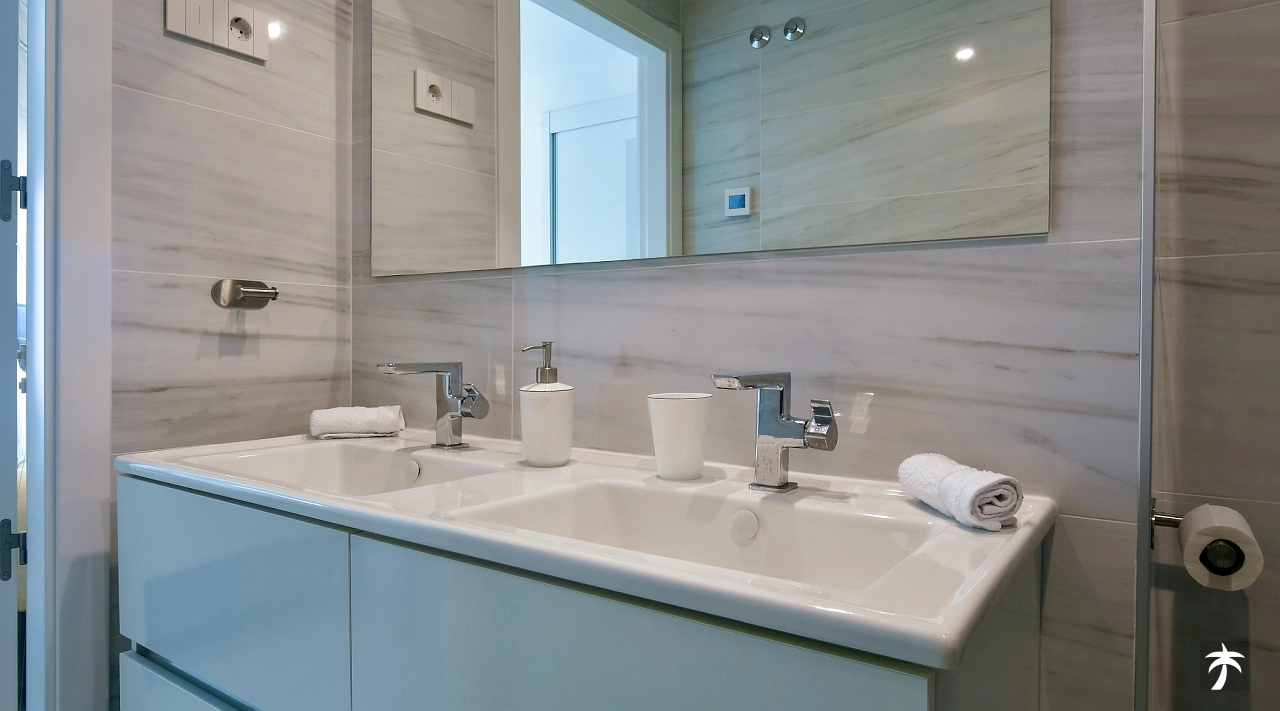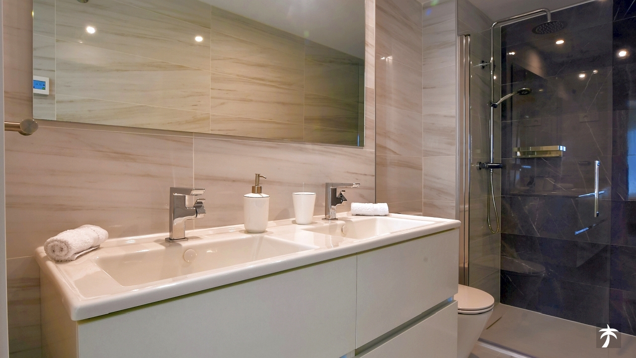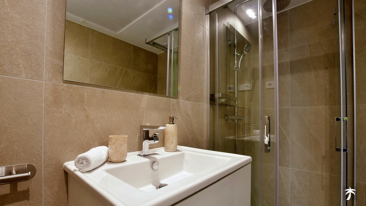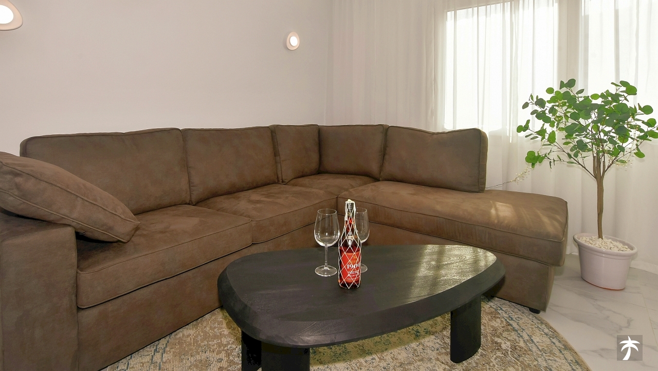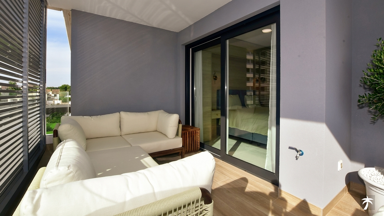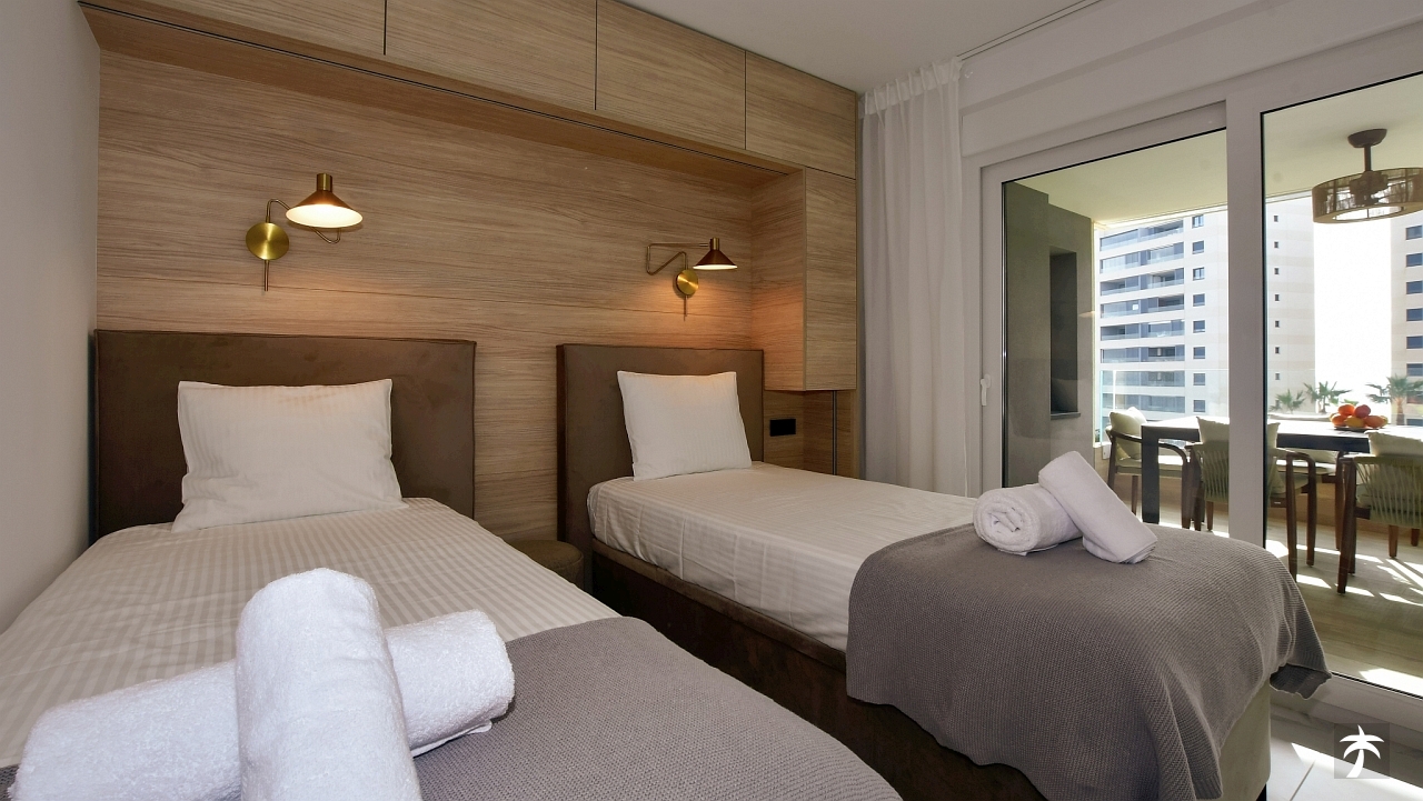 The flat is located on the second floor. It offers two bedrooms and two bathrooms with showers. Large terrace can be accessed directly from the living room and from the master bedroom. It offers a panoramic view of the recreational area and the sea.
