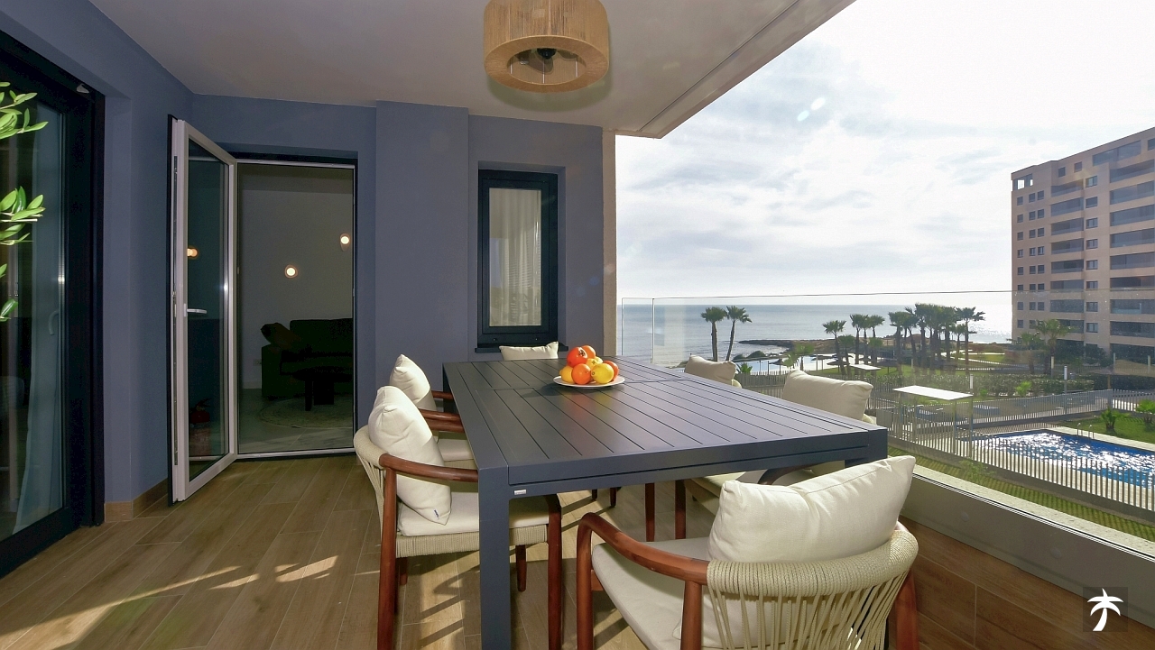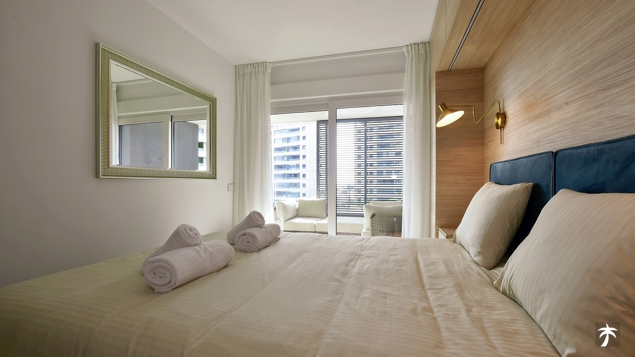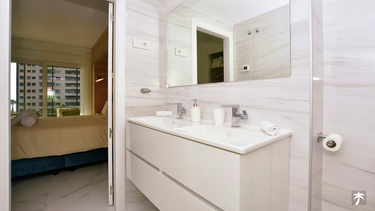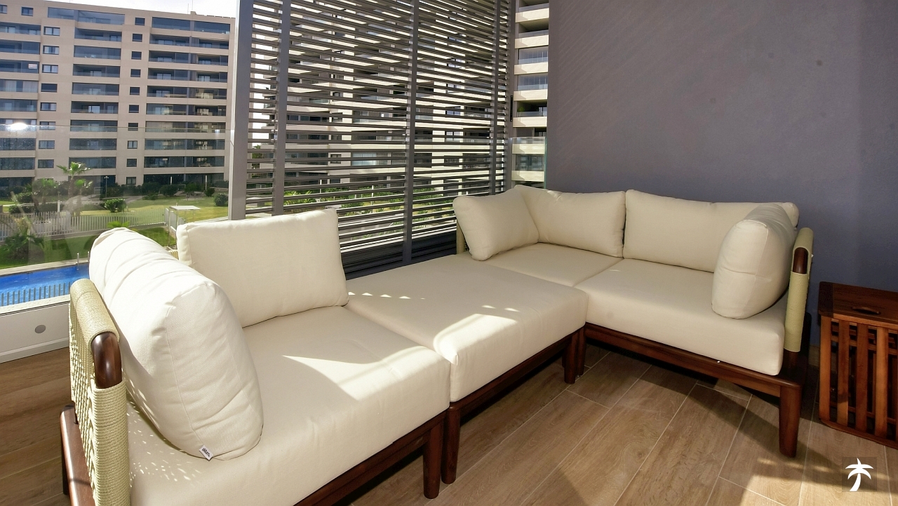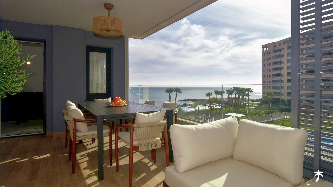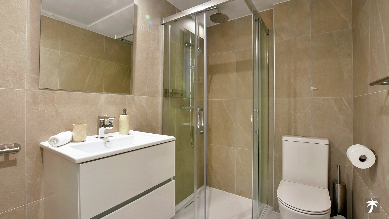 The flat is located on the second floor. It offers two bedrooms and two bathrooms with showers. Large terrace can be accessed directly from the living room and from the master bedroom. It offers a panoramic view of the recreational area and the sea.