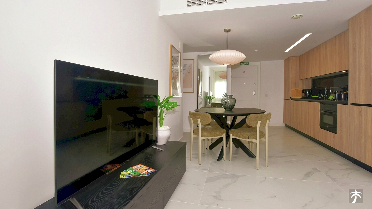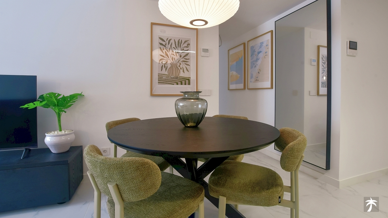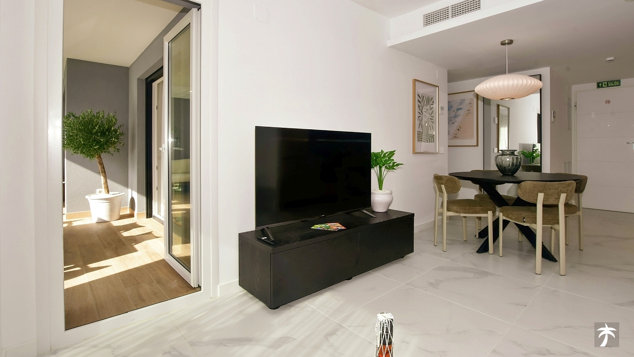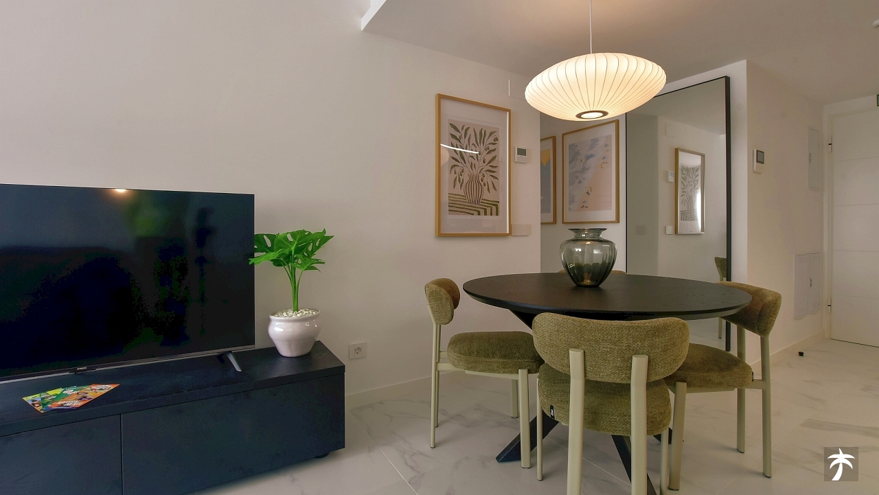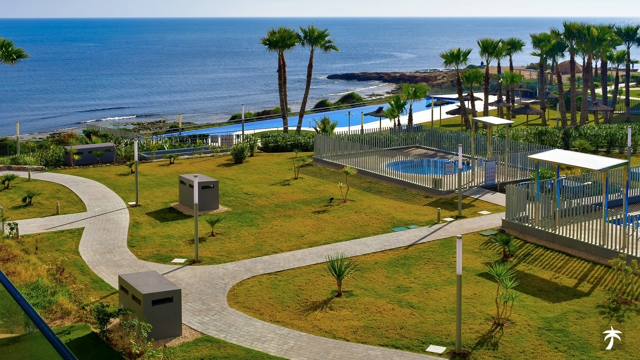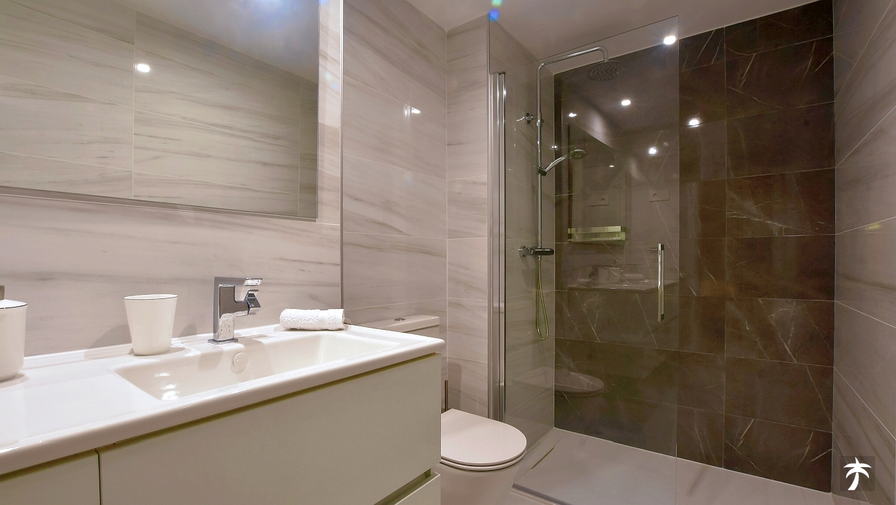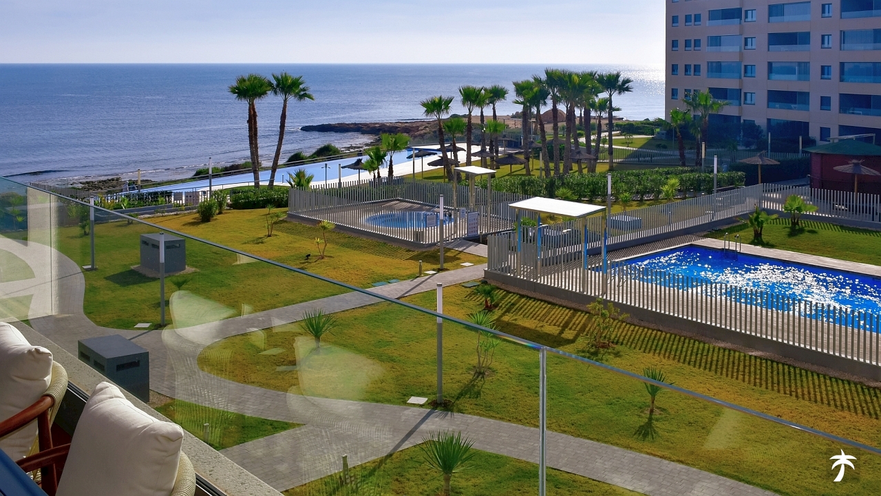 The flat is located on the second floor. It offers two bedrooms and two bathrooms with showers. Large terrace can be accessed directly from the living room and from the master bedroom. It offers a panoramic view of the recreational area and the sea.
