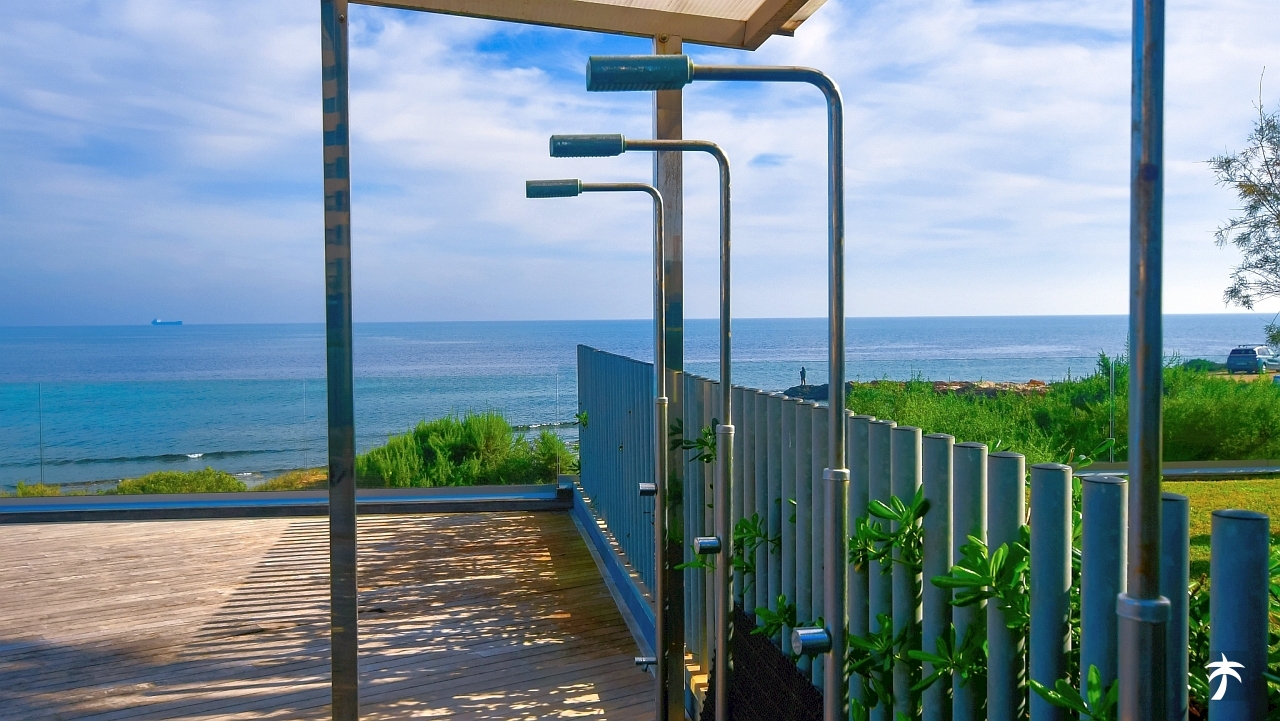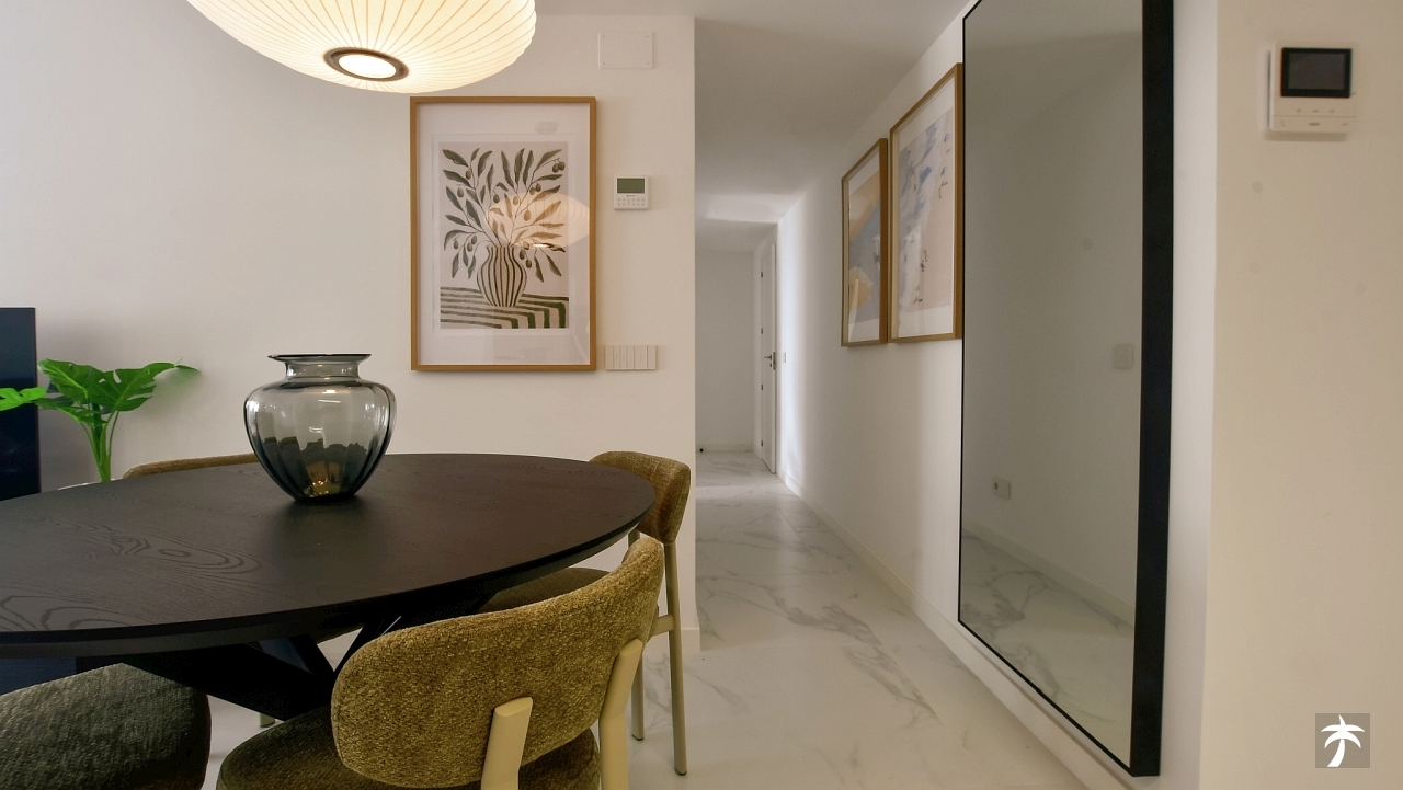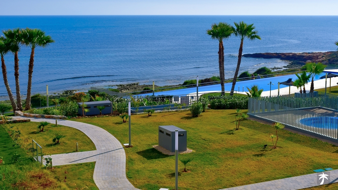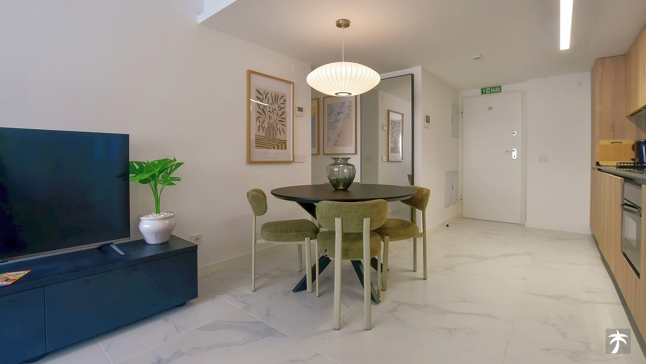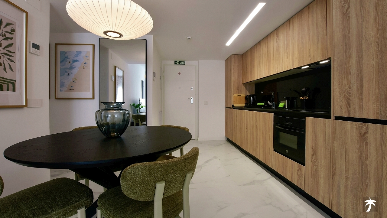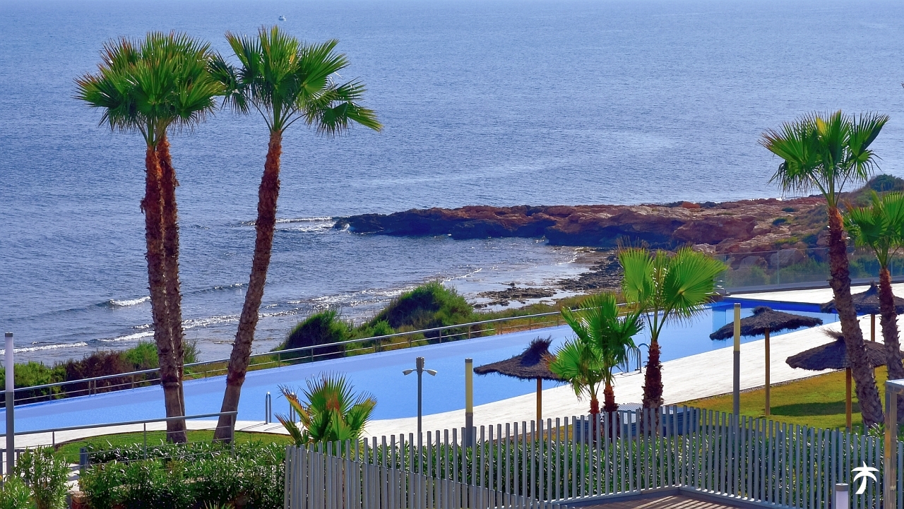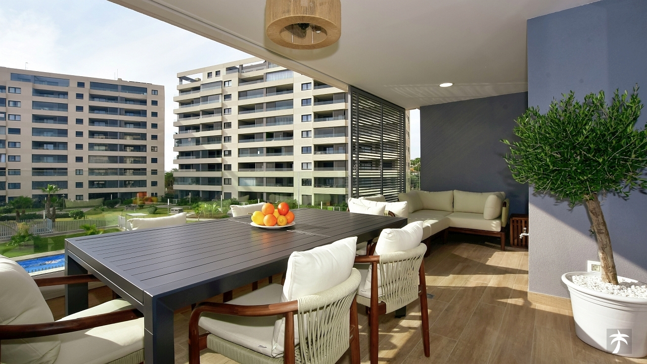 The flat is located on the second floor. It offers two bedrooms and two bathrooms with showers. Large terrace can be accessed directly from the living room and from the master bedroom. It offers a panoramic view of the recreational area and the sea.